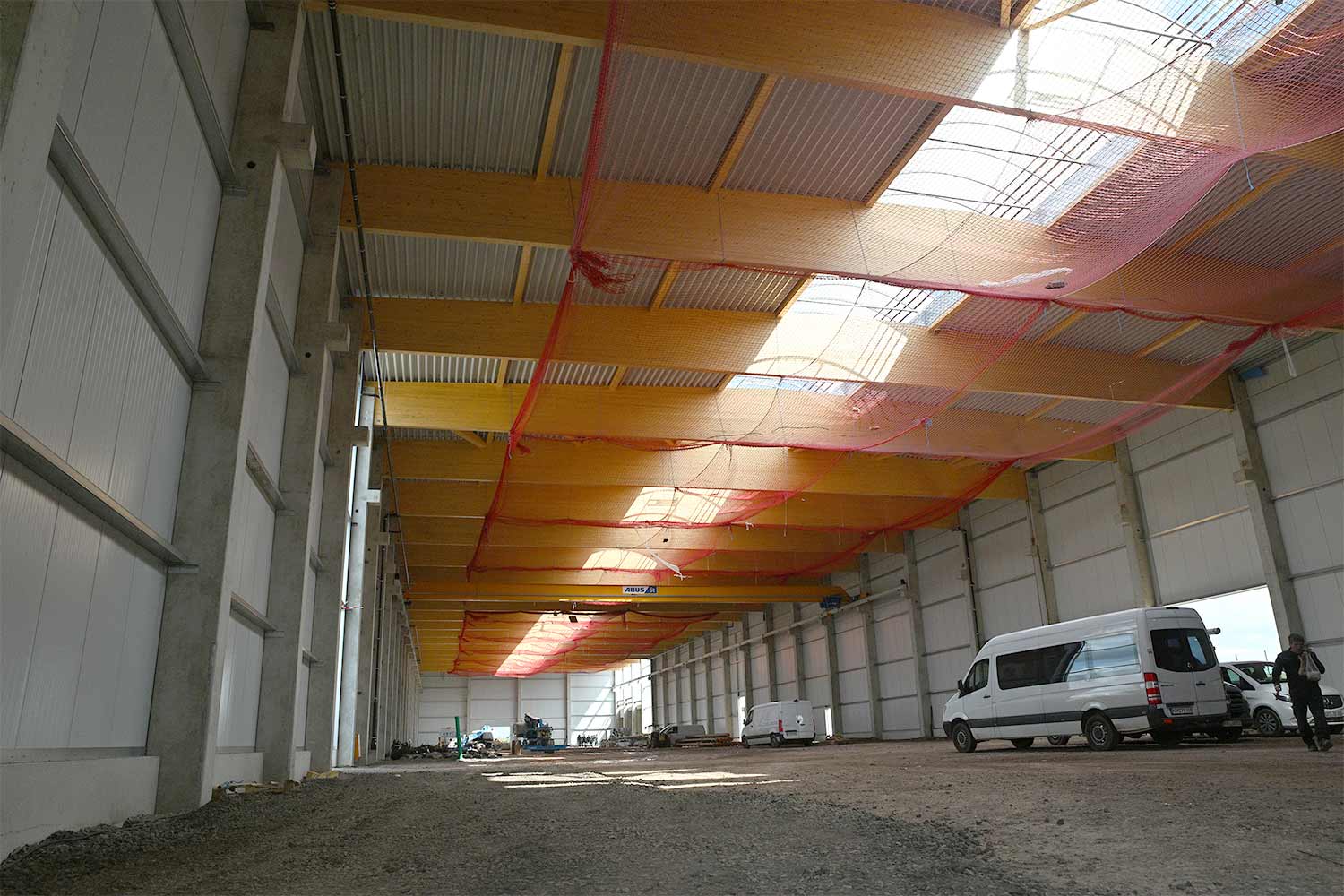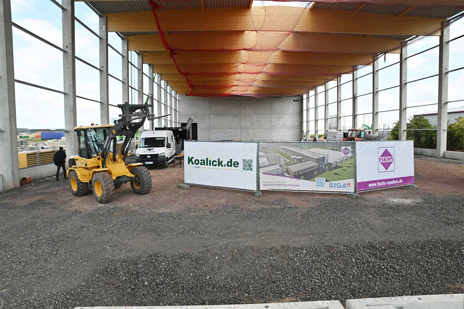 Nachhaltig, markant, solide und charakteristisch zugleich prägt der nachwachsende Rohstoff Holz bereits im jetzigen Baustadium das Erscheinungsbild des Gewerbestandorts. Die bis zu 31 m langen Holzbinder des Dachtragwerks sind jedoch nicht der einzige hölzerne Hingucker: Auch der zweigeschossige Verbindungsbau, der später den baulichen Übergang zwischen der Halle und der neuen Energiezentrale des Standorts schafft, erstrahlt zukünftig mit einer Fassade aus Holz.