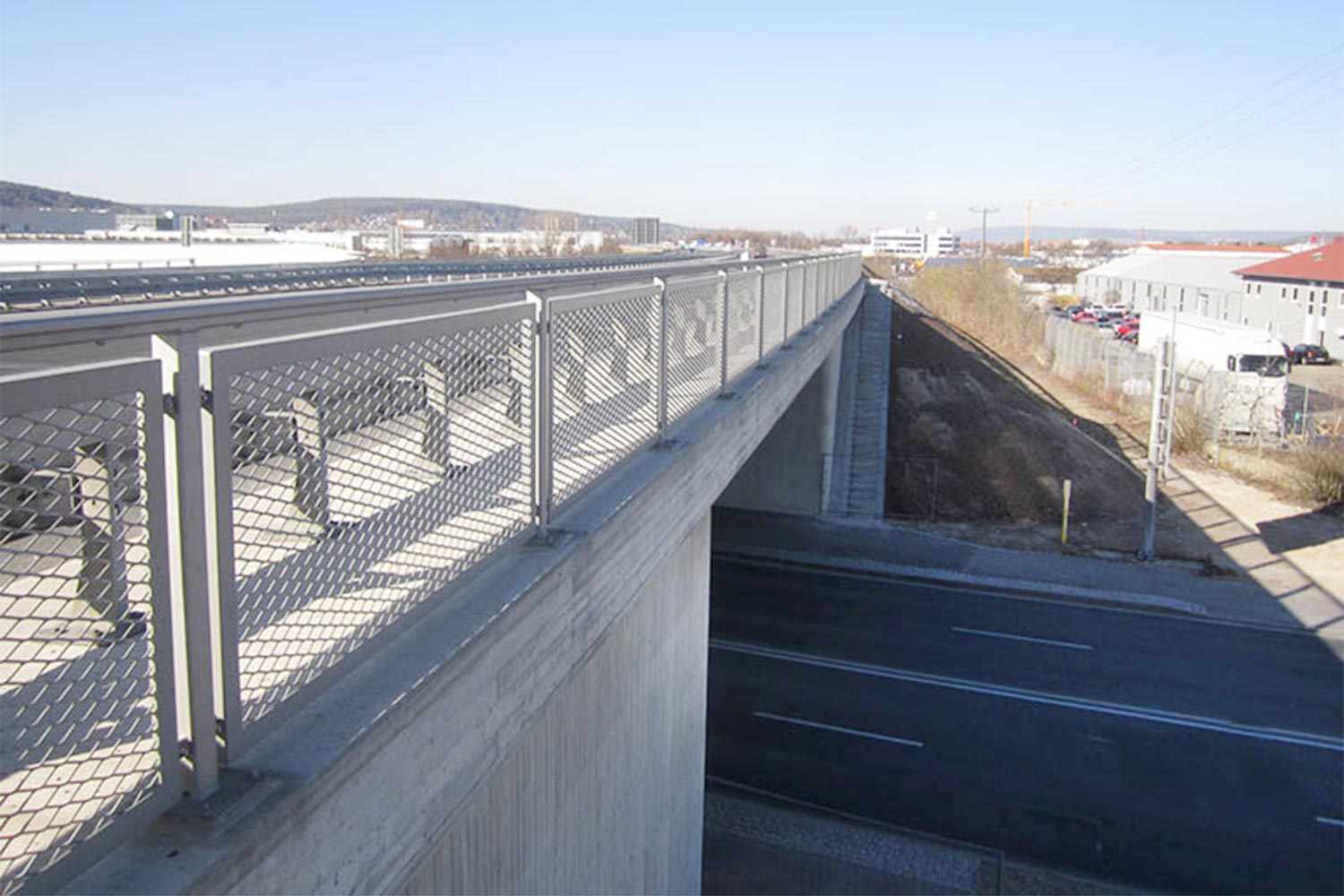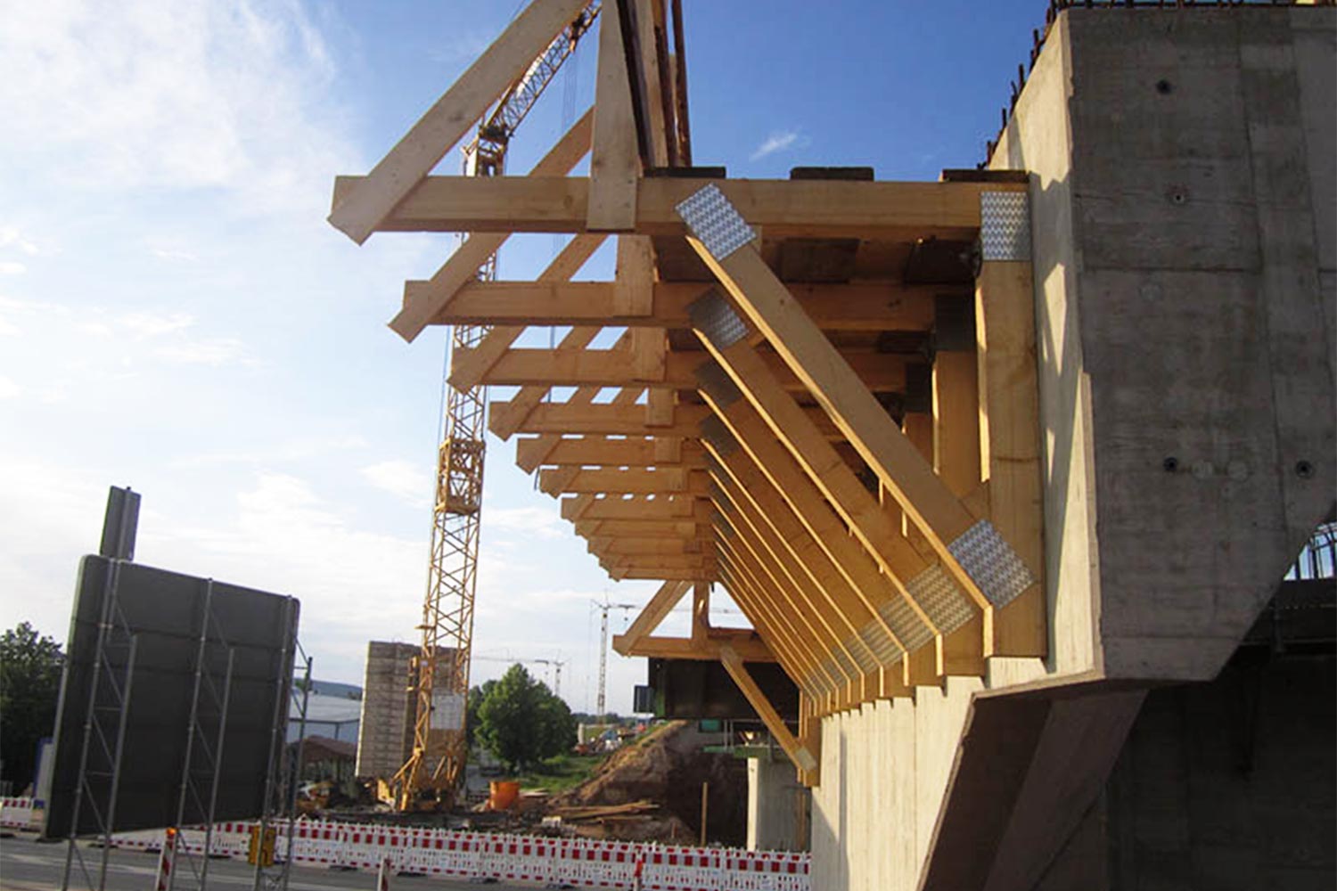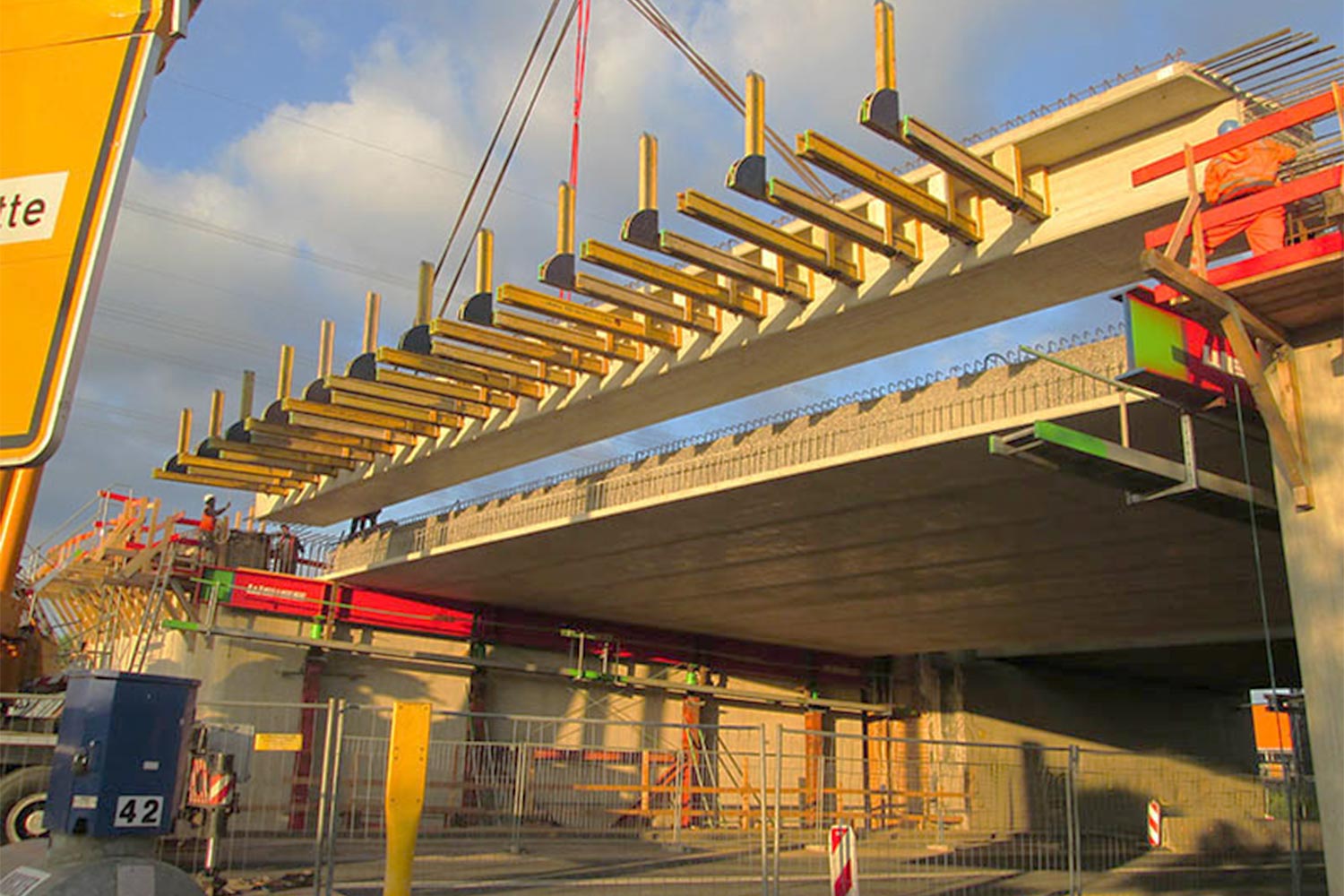 Fertigteile werden im Brückenbau immer dann verwendet, wenn der Verkehr auf der darunter liegenden Straße möglichst wenig eingeschränkt werden darf. In diesem Fall dauerte die Sperrung für den Abbruch der alten Brücke weniger als 24 Stunden und die Fertigteile wurden in einer Nacht verlegt.