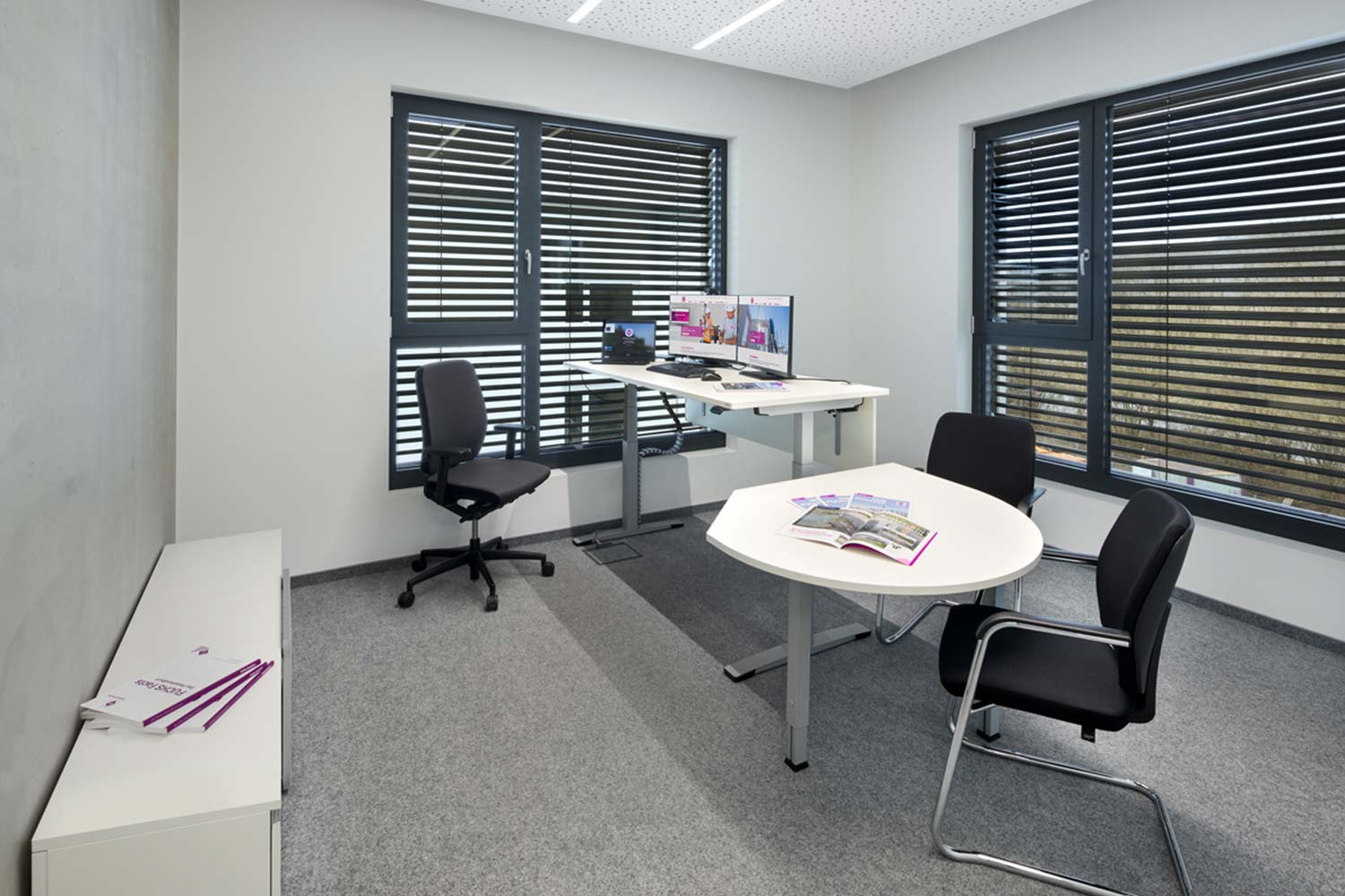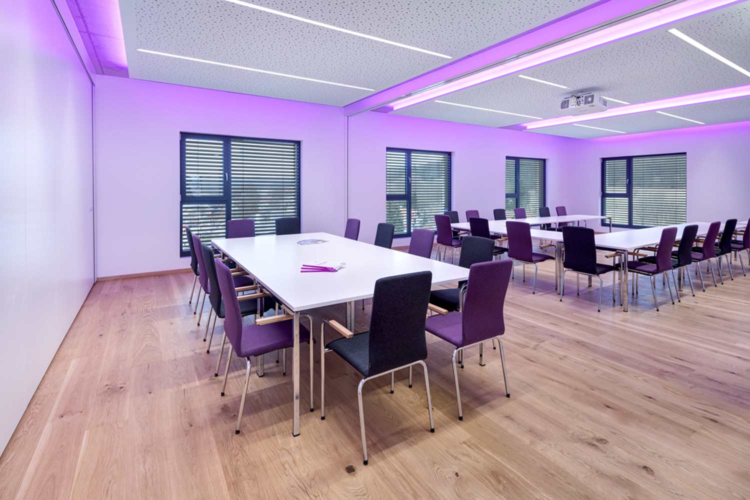 Beim Eintritt in das sechsstöckige Bürogebäude erschließt sich dem Betrachter sofort das Konzept des neuen Verwaltungshauptsitzes: Große Fenster, weite Räume, helle Gestaltung mit lila Lichtern und offene Betonstützen. Der repräsentative Eingangsbereich spiegelt den Gemeinschaftsgeist der Firmenfamilie wider und wirkt einladend auf Mitarbeiter und Geschäftspartner. Offene Kommunikationszonen außerhalb der Büros sowie mehrere Besprechungsräume sorgen für einen regen Austausch zwischen den Kolleg*innen und schaffen dennoch Rückzugsorte für vertrauliche Gespräche. Glaselemente neben den Türen schaffen außerdem Transparenz zwischen den Räumen. Ein flexibler Mix aus Einzel‑, Doppel- und Großraumbüros bietet viele Möglichkeiten, für Projektteams unterschiedlicher Größe den perfekten Rahmen zu gewährleisten.